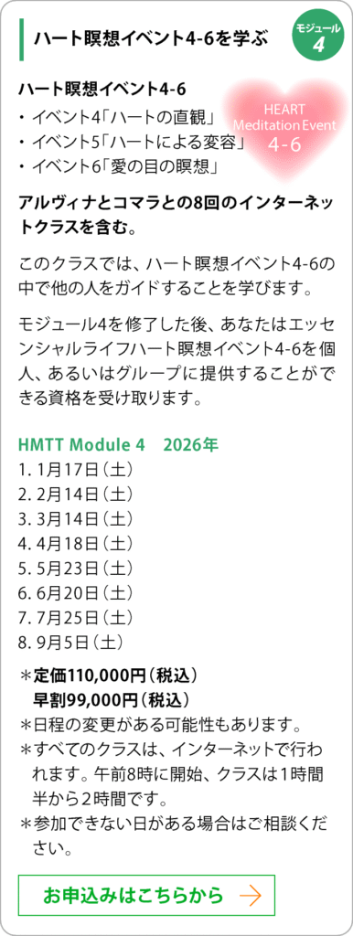 クラスでは、ハート瞑想イベント4−6を他の人にガイドすることを学びます。